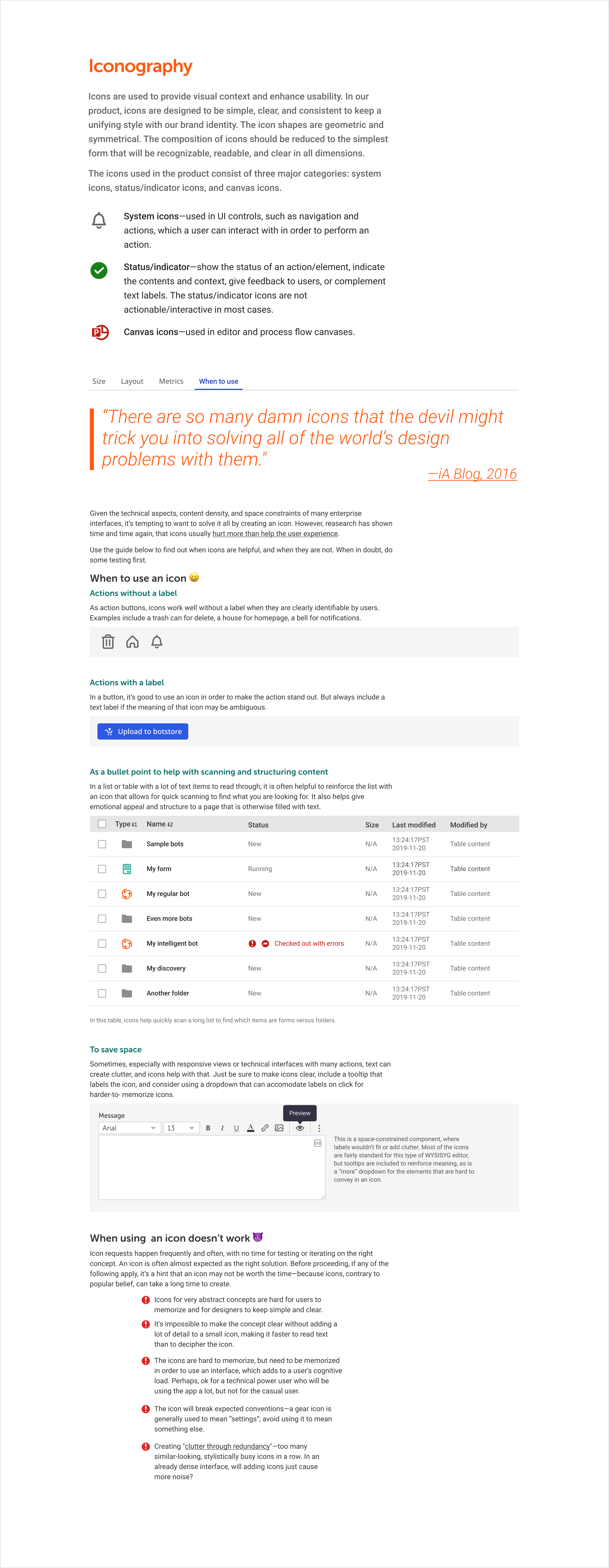 A robust icon library was key for a technical product, but things had gotten out of hand. In addition to icon design guidelines, I provided a clear perspective on when to use icons and when not to.